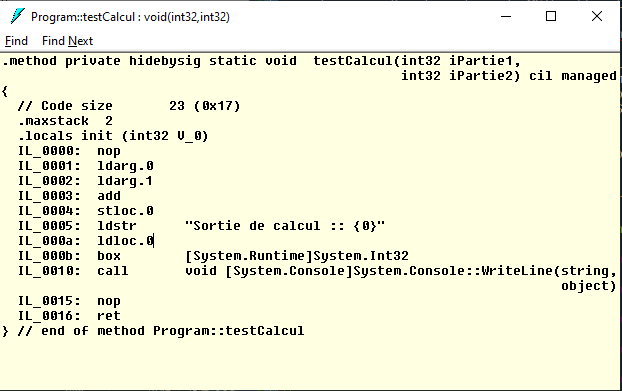 Le code C# suivant effectue une simple addition de deux valeurs numériques via la méthode testCalcul. Les binaires .NET ne contiennent pas d'instructions spécifiques à la plateforme, mais utilisent un code IL indépendant, généré à l'aide du compilateur C# correspondant (csc.exe) pendant le processus de compilation :