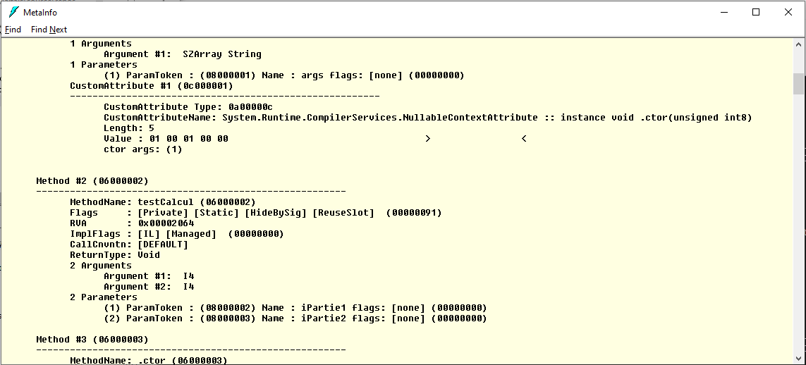De plus, si vous souhaitez explorer les métadonnées de type pour l'assemblage actuellement chargé, appuyez sur Ctrl+M (View > MetaInfo > Show!) affichant les métadonnées sur la méthode de calcul du test comme dans l'exemple suivant :