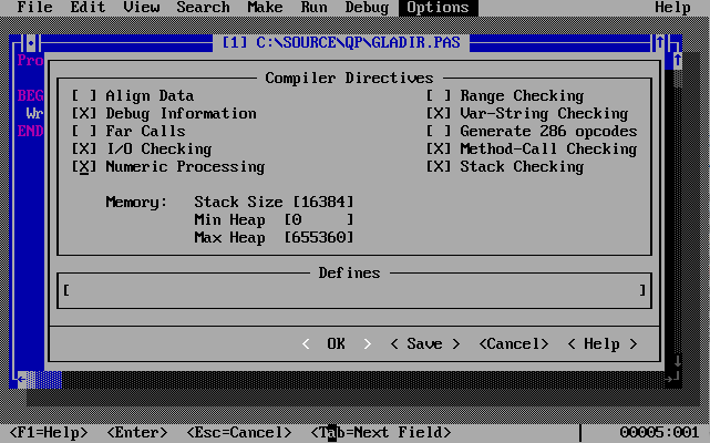 Si vous envisagez de développer des applications reposant fortement sur des calculs à virgule flottante, vous devriez envisager d'investir dans un coprocesseur numérique. Cependant, même si un coprocesseur mathématique est installé sur votre ordinateur, le QuickPascal ne générera pas automatiquement le code machine nécessaire à son utilisation. Pour profiter d'un coprocesseur, le programme doit être compilé avec l'option Numeric Processing {$N+} activée. Le fichier exécutable résultant (.EXE) essaiera d'appeler le coprocesseur chaque fois qu'il rencontrera une instruction impliquant un ou plusieurs nombres réels. Si aucun coprocesseur n'est disponible, le programme se terminera avec un message d'erreur indiquant qu'un coprocesseur est requis.