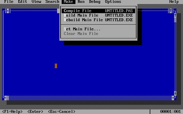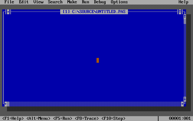 Le QuickPascal commence par vous placer dans un fichier ouvert et vide nommé UNTITLED, comme le montre l'image suivante. Dans cette première session, vous ne ferez aucune programmation originale, vous pouvez donc fermer cette fenêtre en appuyant sur Ctrl+F4.