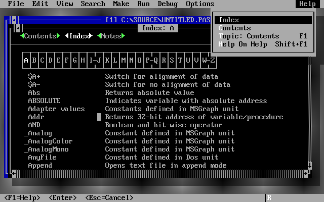 L'aide est disponible sur près de 500 sujets distincts, y compris les mots-clefs, les opérateurs, les procédures et fonctions standard et les constantes symboliques. Une aide contextuelle est également disponible pour expliquer les options de menu et les sélections des boîtes de dialogue.
