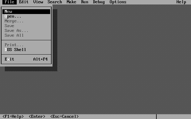 Appuyez sur la touche Alt pour activer le menu principal. Vous pouvez sélectionner l'un des menus en appuyant sur la première lettre de son nom. Essayez vous-même en appuyant sur F pour ouvrir la première lettre de son nom. Essayez vous-même en appuyant sur F pour ouvrir le menu File comme le montre l'image suivante. Pour charger un fichier texte source existant dans l'environnement QuickPascal, choisissez la commande Open en appuyant sur O.