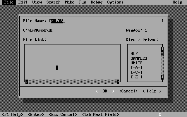 Le QuickPascal affiche immédiatement une boîte de dialogue contenant une liste alphabétique de tous les fichiers du répertoire courant ayant l'extension .PAS. (Par défaut, le QuickPascal suppose que tout fichier se terminant par .PAS contient le texte source Pascal.) Si vous avez utilisé l'option Easy Setup, tous les fichiers .PAS sont dans le sous-répertoire SAMPLES et aucun nom de fichier ne sera affiché. L'image suivante montre ce que vous verrez :