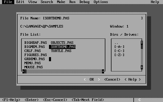 Pour sélectionner le programme SORTDEMO.PAS, appuyez sur la touche Tab pour déplacer le curseur sur la zone de fichier. Ensuite, utilisez les touches de flèches pour positionner le curseur sur la zone de fichier. L'image suivante montre que l'écran ressemble à ce point. Appuyez sur Enter pour ouvrir le fichier.