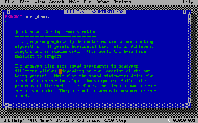 Vous pouvez suivre les instructions du programme pour en apprendre davantage sur les techniques de tri. Appuyez sur la touche Esc lorsque vous avez terminé le programme. Le QuickPascal affichera alors un résumé du temps que vous avez passé dans le programme. Appuyez sur n'importe quelle touche pour revenir à l'environnement QuickPascal. Utilisez le raccourci clavier Alt+F4 pour quitter QuickPascal. Si vous en avez fait, il vous demande si vous souhaitez enregistrer la nouvelle version du texte source. Pour cet exemple, si vous avez apporté des modifications, appuyez sur N pour quitter l'environnement sans les enregistrer.