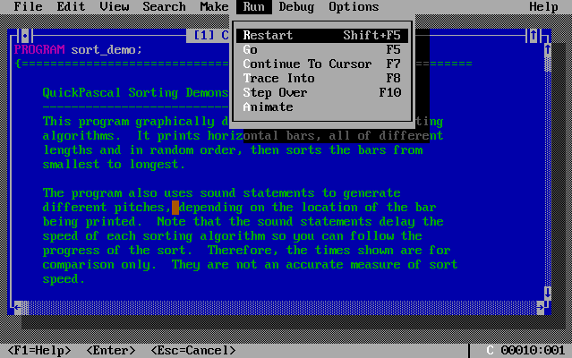Pour compiler et exécuter le programme SORTDEMO, appuyez sur Alt+R pour ouvrir le menu Run. L'image suivante montre l'écran à ce stade. Lorsque le menu apparaît, sélectionnez la commande Go en appuyant sur G. (Notez que vous auriez pu utiliser le raccourci clavier F5 à la place.) Le QuickPascal commencera à compiler le programme, affichant sa progression dans une boîte de dialogue. Une fois la compilation terminée, le programme sera exécuté.