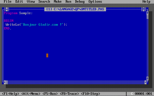 Appuyez sur F5 pour compiler et exécuter le programme. Si le programme contient une erreur, le QuickPascal arrêtera la compilation, positionnera le curseur sur l'instruction contenant l'erreur et affichera un message d'erreur. Vous pouvez corriger le problème et relancer le programme en appuyant une deuxième fois sur F5. La sortie du programme apparaîtra alors à l'écran.