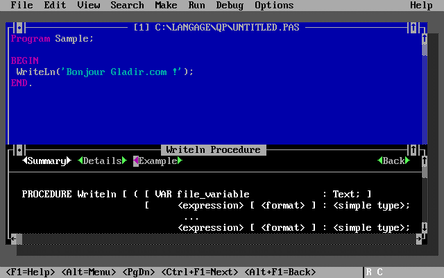 Étant donné qu'il s'agit de votre première rencontre avec la procédure WriteLn, vous voudrez peut-être en savoir plus à ce sujet auprès du QuickPascal Advisor. Si c'est le cas, placez simplement le curseur sur n'importe quelle lettre du mot WriteLn et appuyez sur la touche F1 comme le montre l'image suivante :