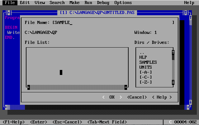 Vous devez maintenant enregistrer le programme. Appuyez sur Alt+F pour accéder au menu File, puis sélectionnez l'option Save As. Le QuickPascal utilisera UNTITLED comme nom de fichier par défaut, mais vous pouvez utiliser le nom de votre choix. Le nom du programme est SAMPLE, donc utilisez-le également pour le nom du fichier. Lorsque vous entrez le nouveau nom de fichier (SAMPLE), le nom de fichier d'origine (UNTITLED) disparaît automatiquement. Appuyez sur Enter lorsque vous avez terminé. L'image suivante montre la boîte de dialogue après avoir entré le nom du fichier. Après avoir enregistré le fichier, les caractères UNTITLED dans le titre de la fenêtre deviendront SAMPLE. Si vous ne spécifiez pas d'extension, QuickPascal utilisera .PAS par défaut.