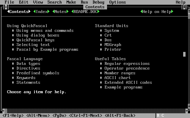Le QuickPascal Advisor contient un fichier README différent du fichier README.DOC sur le disque. C'est le bon moment pour revoir son contenu. Pour consulter le fichier README, lancez QuickPascal en entrant QP au prompt DOS. Une fois QuickPascal chargé, appuyez sur H pour ouvrir le menu Help et appuyez sur C pour sélectionner la commande Contenu. L'image suivante montre l'écran à ce stade :
