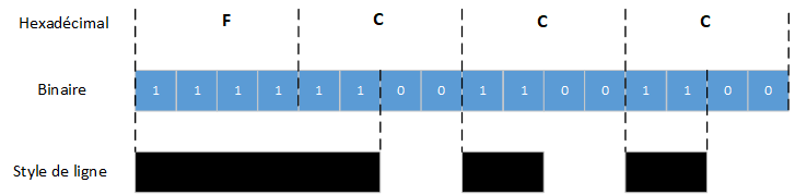 La routine _SetLineStyle prend un seul paramètre consistant en un masque de 16 bits, où chaque bit représente un pixel dans la ligne. Si un bit est défini sur 1, le pixel correspondant est allumé avec la couleur de dessin actuelle. La couleur du pixel est inchangée si son bit est à 0. Bien que le motif ne fasse que 16 bits, il se répète sur toute la longueur de la ligne. La valeur du motif par défaut - une ligne continue - est $FFFF.