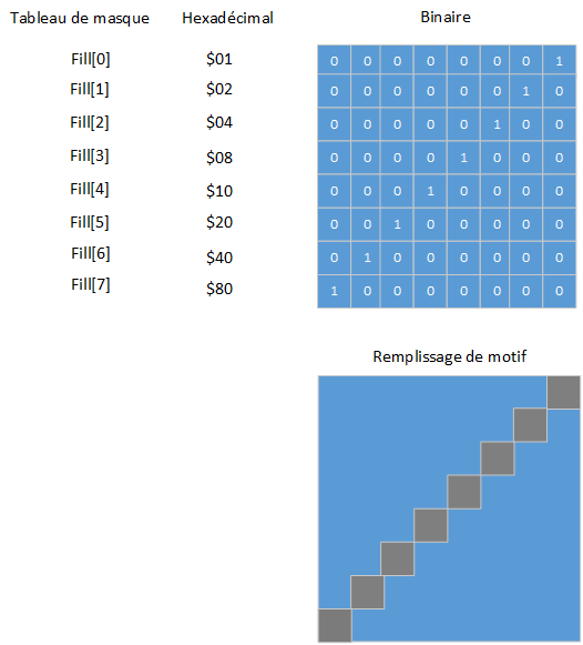 Le motif de remplissage est un réseau de pixels 8x8, répété sur toute la région. Lorsque vous avez spécifié un style de ligne personnalisé comme indiquer plus tôt, vous avez contrôlé chaque pixel avec le réglage d'un seul bit. Vous pouvez contrôler les 64 bits du motif de remplissage de la même manière.