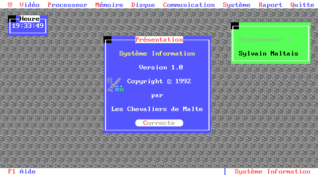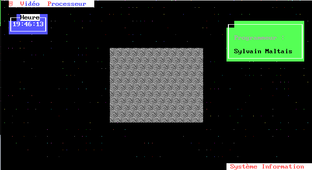 Le projet Système Information est un projet que j'ai écrit en Turbo Pascal lorsque j'avais 18 ans, soit en 1992. Il permettait d'obtenir de nombreuses informations sur le système, la carte vidéo et presque toutes les composantes imaginables de l'époque. En plus, il avait un côté assez spectaculaire, comme des animations en écran de texte et il utilisait une police de caractères particulière afin par exemple d'afficher une épée en écran de texte.