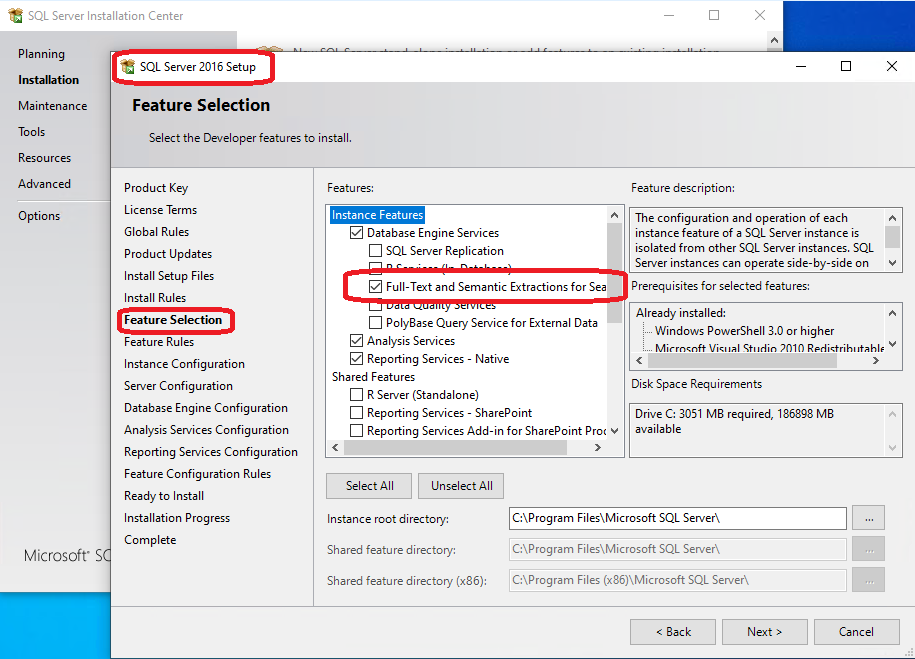 - Pour pouvoir utiliser CONTAINS, assurez-vous d'avoir installé Full-Text Search dans les Features Selection de SQL Server :