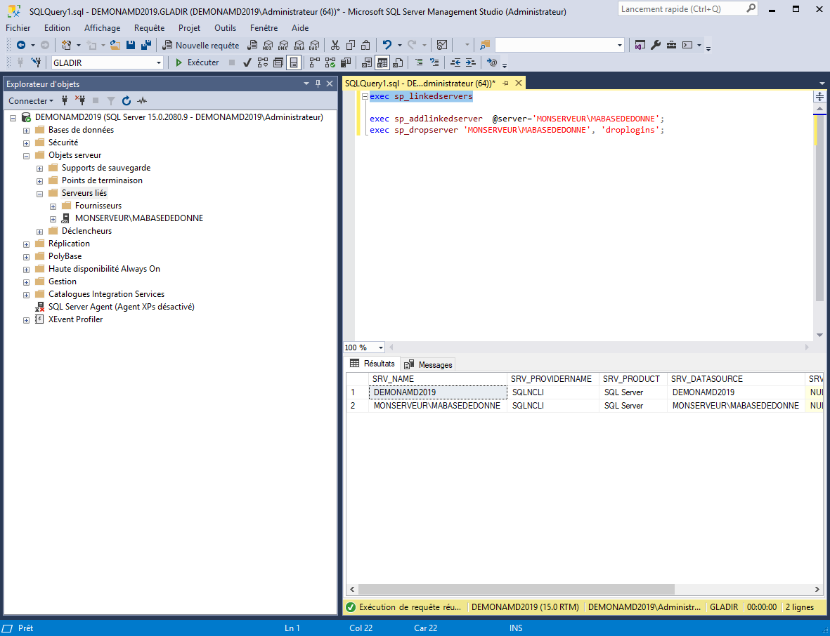 - On peut supprimer le lien créer par la Stored Procedure sp_addlinkedserver en utilisant la Stored Procedure sp_dropserver et on peut voir la liste des liens en utilisant la Stored Procedure sp_linkedservers.