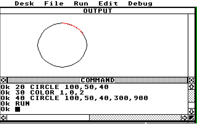 - Le troisième paramètre, le rayon, est également exprimé en pixels. Le nombre de pixels horizontaux et verticaux dépend de la résolution sélectionnée et de la taille de la fenêtre de sortie. Le cercle est dessiné dans la couleur du tracé (paramètre 3 de l'instruction COLOR).