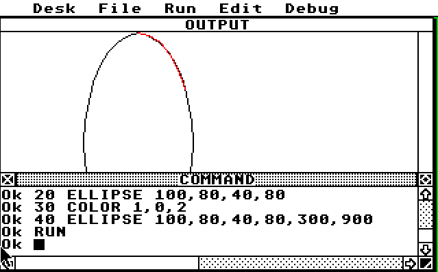 - Les troisième et quatrième paramètres, rayons horizontal et vertical, sont également exprimés en pixels. Le nombre de pixels horizontaux et verticaux dépend de la résolution sélectionnée et de la taille de la fenêtre de sortie. L'ellipse est dessinée dans la couleur du tracé (paramètre 3 de l'instruction COLOR).