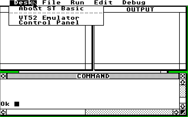 Cette page décrit les menus disponibles à partir du bureau ST BASIC. Les titres du menu sont Desk, File, Run, Edit et Debug. Ils sont situés le long du bord supérieur du bureau ST BASIC dans la barre de menus. Chaque rubrique a son propre menu. Pour accéder à un menu, pointez sur l'entête du menu. Le mot deviendra grisé et le menu apparaîtra. Si vous ne souhaitez pas sélectionner un élément de menu, cliquez n'importe où ailleurs sur le bureau ST BASIC et le menu réapparaîtra dans la barre de menus.