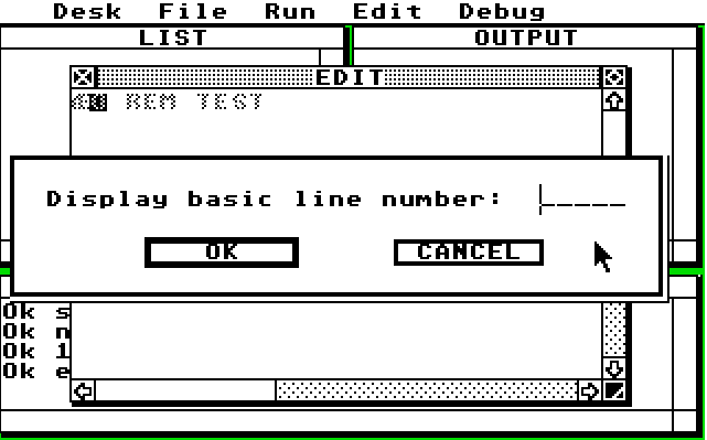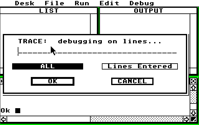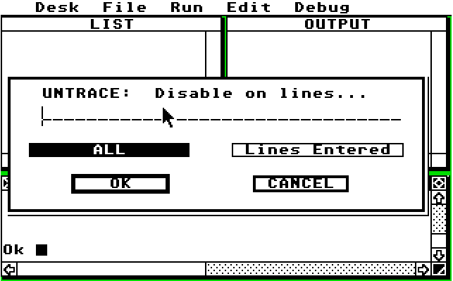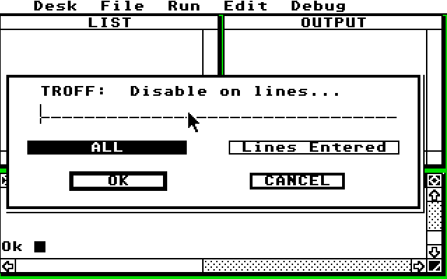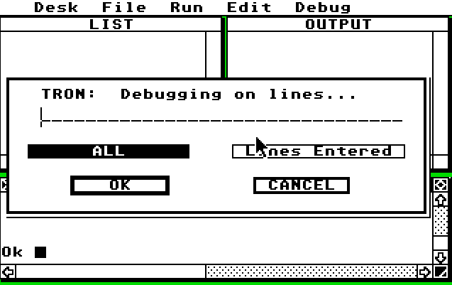 L'option Tron de ST BASIC affiche le numéro de ligne actuel pendant l'exécution du programme ST BASIC. Sélectionnez l'option Tron et la boîte de dialogue suivante s'affiche :