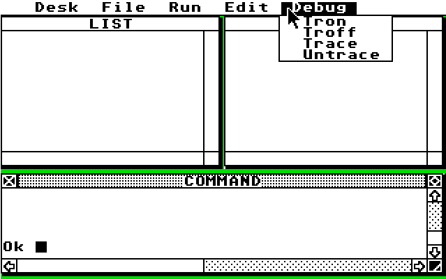 Le menu Debug contrôle les fonctionnalités de débogage de ST BASIC pouvant être contrôlées via les menus ST BASIC.