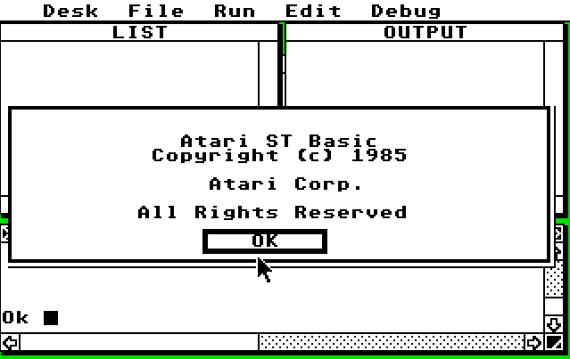 Cette option est le panneau d'affichage du programme d'applications. Les droits d'auteur et les informations générales sur le programme s'affichent. Sélectionnez l'option About ST BASIC et la boîte de dialogue suivante s'affiche :