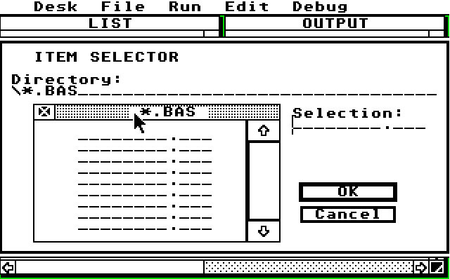 L'option Delete File un programme ST BASIC d'une disquette. Lorsque vous sélectionnez l'option Delete File, la boîte de sélection d'éléments s'affiche. Pour supprimer un fichier, double-cliquez sur le nom du fichier ou cliquez une fois sur le nom du fichier puis cliquez sur le bouton OK.