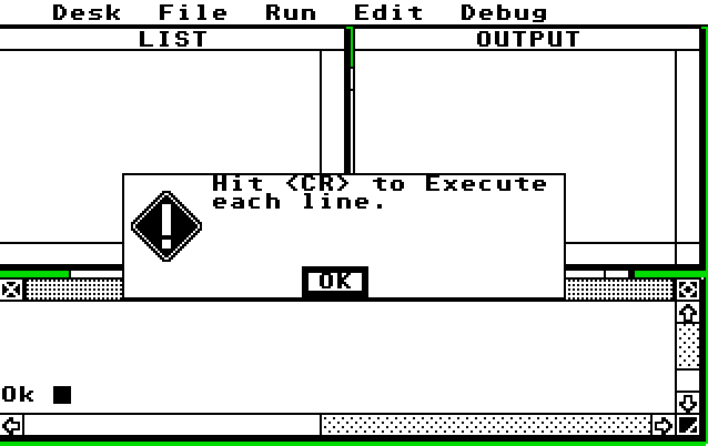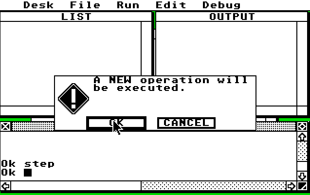 Cliquez sur le bouton Ok pour valider la procédure Step. Chaque fois que vous appuyez sur la touche Return, la ligne de programme suivante est exécutée. Appuyez sur Control+G pour quitter l'option Step.