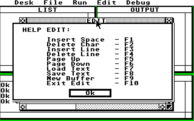 Chaque élément de la boîte de dialogue Help Edit correspond à une option du menu Edit. Les désignations des touches de fonction - F1 à F10 - correspondent aux touches de fonction du clavier de l'ordinateur Atari ST. Chaque fonction peut être accomplie via l'option de menu ou en appuyant sur la touche de fonction appropriée.