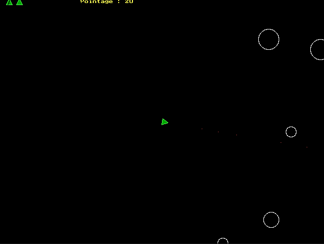 Le déplacement des astéroïdes est une simple ligne droite dans lequel on ajoute une quantité fixe horizontale et verticale jusqu'à ce qu'il sorte de l'espace visible de l'écran, qu'il soit détruit par un tire ou qu'il frappe le vaisseau. Lorsqu'un astéroïdes est détruit, il augmente le pointage du joueur.