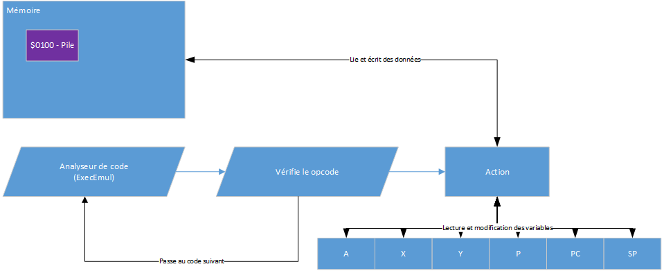 Le rôle d'un émulateur 6502 n'est pas si compliqué en soi, il s'agit de passer un par un chaque octet de mémoire (opcode) et d'effectuer les actions en mémoire en fonction de l'opération demandée. Une opération peut être, une addition, une soustraction, des tests, des opérateurs binaires, des déplacements du compteur de programme en mémoire, l'affectation de la pile,... Voici un schéma d'un émulateur 6502 :