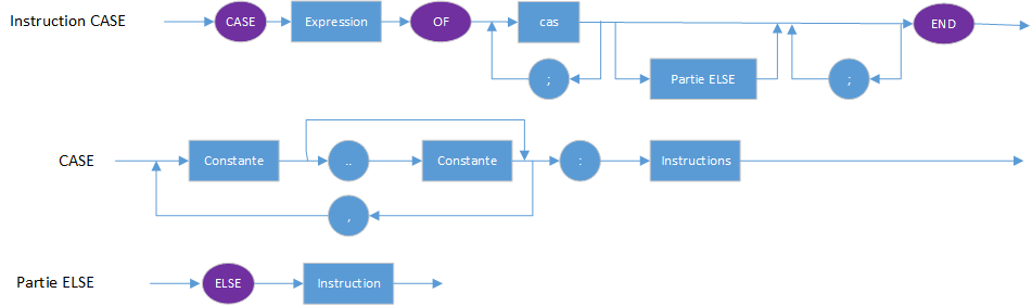 L'instruction CASE se compose d'une expression (le sélecteur) et d'une liste d'instructions, chacune précédée d'une ou plusieurs constantes (appelées constantes CASE) ou du mot ELSE. Le sélecteur doit être d'un type ordinal de la taille d'un octet ou d'un mot, de sorte que les types chaîne de caractères et le type entier LongInt sont des types de sélecteur non valides. Toutes les constantes de casse doivent être uniques et d'un type ordinal compatible avec le type de sélecteur.