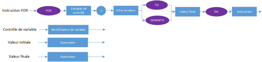 L'instruction contenue par l'instruction FOR est exécutée une fois pour chaque valeur comprise entre la valeur initiale et la valeur finale. La variable de contrôle démarre toujours à la valeur initiale. Lorsqu'une instruction FOR utilise TO, la valeur de la variable de contrôle est incrémentée de un pour chaque répétition. Si la valeur initiale est supérieure à la valeur finale, l'instruction contenue n'est pas exécutée. Lorsqu'une instruction FOR utilise DOWNTO, la valeur de la variable de contrôle est décrémentée de un pour chaque répétition. Si la valeur initiale est inférieure à la valeur finale, l'instruction contenue n'est pas exécutée.