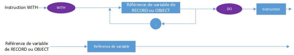 L'instruction WITH est un raccourci pour référencer les champs d'un enregistrement et les champs et méthodes d'un objet. Dans une instruction WITH, les champs d'une ou plusieurs variables d'enregistrement spécifiques peuvent être référencés à l'aide de leurs identifiants de champ uniquement. La syntaxe d'une instruction WITH suit :