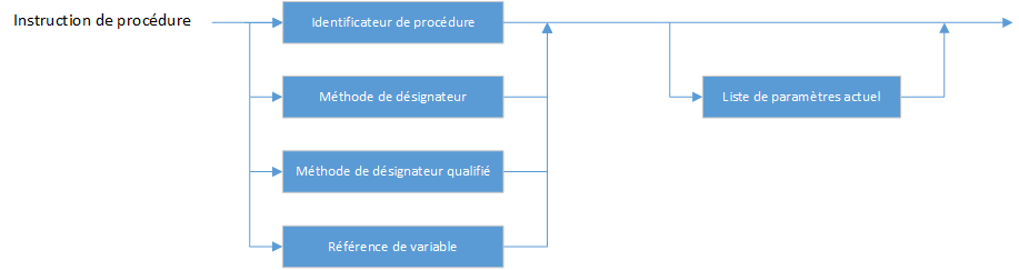 Une instruction de procédure active une procédure spécifiée par un identificateur de procédure, un indicateur de méthode, un indicateur de méthode qualifié ou une référence de variable de type procédural. Si la déclaration de procédure correspondante contient une liste de paramètres formels, alors l'instruction de procédure doit avoir une liste correspondante de paramètres réels (les paramètres répertoriés dans les définitions sont des paramètres formels ; dans l'instruction appelante, ce sont des paramètres réels). Les paramètres réels sont transmis aux paramètres formels dans le cadre de l'appel.