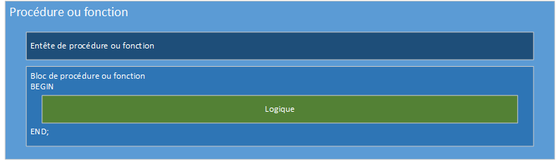 Le code entre le dernier BEGIN et la dernière END d'un programme pilote la logique du programme. Dans un programme très simple, cette section de code pourrait être tout ce dont vous avez besoin. Dans des programmes plus gros et plus complexes, mettre tout votre code ici peut rendre votre programme plus difficile à lire et à comprendre, et plus difficile à développer. Les procédures et les fonctions vous permettent de diviser la logique d'un programme en morceaux plus petits et plus faciles à gérer, et sont similaires aux sous-routines de certains autres langages. Toute l'action d'une procédure ou d'une fonction se produit dans le code entre son BEGIN et sa END, tout comme dans le bloc de programme principal. Chacun de ces segments de code exécute une petite tâche discrète.