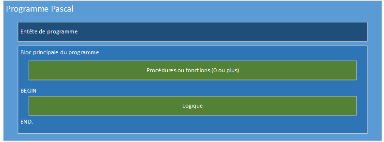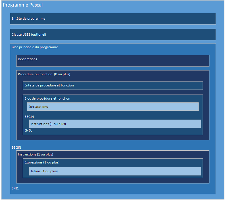 L'entête du programme, la clause facultative USES et le bloc de programme principal constituent un programme Turbo Pascal. Dans le bloc de programme principal peuvent exister les plus petits blocs de procédures et de fonctions. Bien que le diagramme ne le montre pas, les procédures et fonctions peuvent être imbriquées dans d'autres procédures et fonctions. En d'autres termes, les blocs peuvent contenir d'autres blocs.