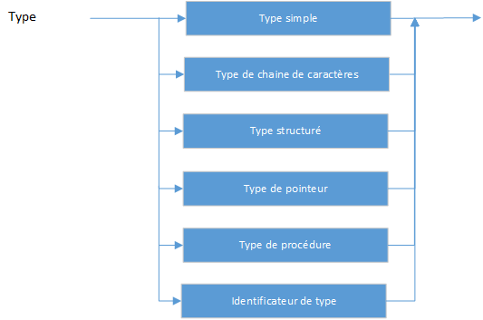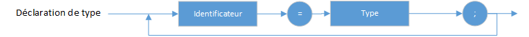 Lorsque vous déclarez une variable, vous devez indiquer son type. Le type d'une variable circonscrit l'ensemble des valeurs qu'elle peut avoir et les opérations pouvant être effectuées sur elle. Une déclaration de type spécifie l'identificateur désignant un type.