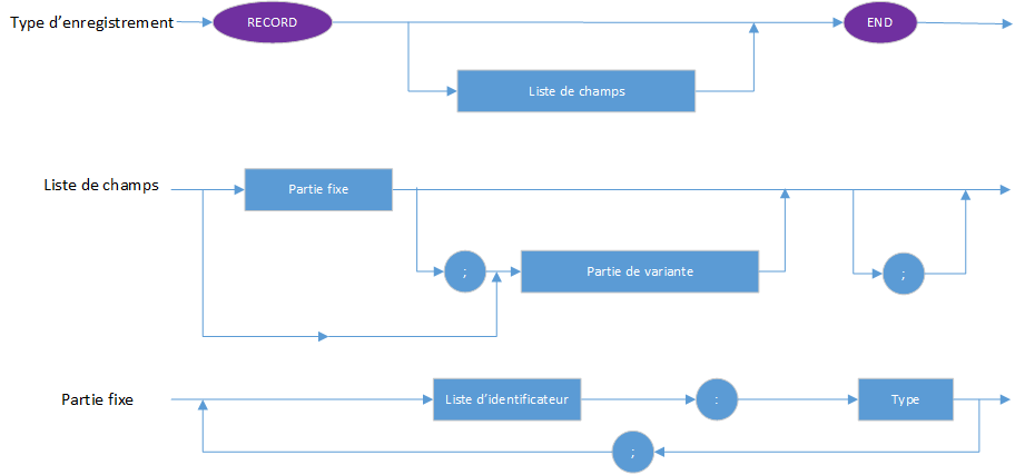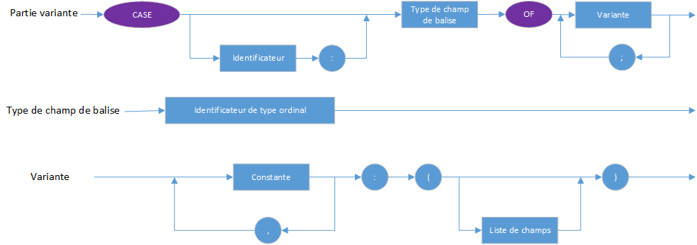 La partie variante illustrée dans le diagramme de syntaxe d'une déclaration de type d'enregistrement distribue l'espace mémoire pour plus d'une liste de champs, de sorte que les informations peuvent être consultées de plusieurs manières. Chaque liste de champs est une variante. Les variantes recouvrent le même espace en mémoire, et tous les champs de toutes les variantes sont accessibles à tout moment :