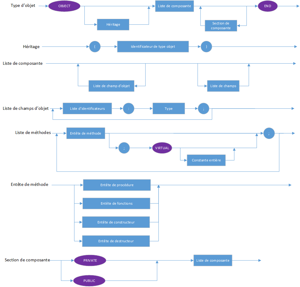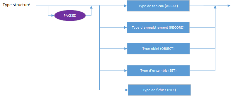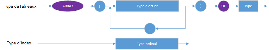 Les tableaux ont un nombre fixe de composantes d'un type, le type de composante. Dans le diagramme de syntaxe suivant, le type de composante suit le mot clef OF :