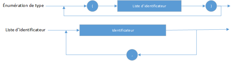 Les types énumérés définissent des ensembles ordonnés de valeurs en énumérant les identificateurs dénotant ces valeurs. Leur ordre suit l'ordre dans lequel les identificateurs sont énumérés.