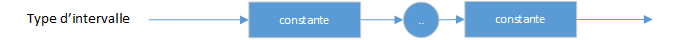 Un type d'intervalle est une intervalle de valeurs d'un type ordinal appelé type d'hôte. La définition d'un type d'intervalle spécifie la plus petite et la plus grande valeur de l'intervalle ; sa syntaxe est la suivante :