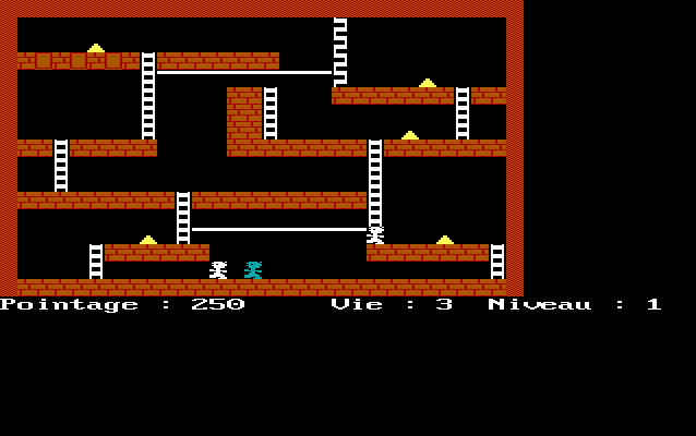 Le jeu est développé en écran de texte avec une programmation des polices de caractères afin de simulé les briques, les joueurs, les lingos d'or et les échelles. Le jeu écrit en écran texte a malheureusement l'inconvénient de ne pas permettre d'avoir deux images superposer l'un par dessus l'autre. On affiche ensuite le niveau courant, lequel ayant été préalablement copié du tableau Tab. La raison pour laquelle on ne joue pas directement dans le tableau Tab et plutôt dans la copie du tableau réside dans le fait que le tableau est modifié en cours de route et par exemple, l'emplacement des ennemis sera perdu a jamais lorsque vous vous faites attraper.
