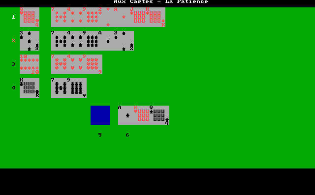 L'exemple de jeu Patience suivant est développé en Turbo Pascal 7 et fonctionne également sous Free Pascal. Voici le code source en Turbo Pascal du jeu :