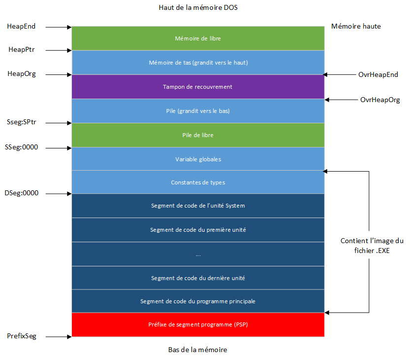 Le segment de données (adressé via DS) contient toutes les constantes typées suivies de toutes les variables globales. Le registre DS n'est jamais modifié pendant l'exécution du programme. La taille du segment de données ne peut pas dépasser 64 Ko. À l'entrée dans le programme, le registre de segment de pile (SS) et le pointeur de pile (SP) sont chargés de sorte que la paire de registres SS:SP pointe vers le premier octet après le segment de pile. Le registre SS n'est jamais modifié pendant l'exécution du programme, mais SP peut descendre jusqu'à ce qu'il atteigne le bas du segment. La taille du segment de pile ne peut pas dépasser 64 Ko; la taille par défaut est 16 Ko, mais cela peut être changé avec une directive de compilation $M. L'unité standard Overlay utilise le tampon de recouvrement pour entreposer le code de recouvrement. La taille par défaut du tampon de recouvrement correspond à la taille du plus grande recouvrement du programme; si le programme n'a pas de recouvrement, la taille du tampon de recouvrement est égale à zéro. La taille du tampon de recouvrement peut être augmentée par un appel à la routine OvrSetBuf dans l'unité Overlay; dans ce cas, la taille du tas est diminuée en conséquence, en déplaçant HeapOrg vers le haut. La mémoire de tas entrepose des variables dynamiquement, c'est-à-dire que les variables sont allouées via des appels aux procédures standard New et GetMem. Il occupe tout ou partie de la mémoire libre laissée à l'exécution d'un programme. La taille réelle de la mémoire de tas dépend des valeurs de tas minimum et maximum, pouvant être définies avec la directive du compilateur $M. Il est garanti que sa taille est au moins la taille minimale de la mémoire de tas et jamais supérieure à la taille maximale de la mémoire de tas. Si la quantité minimale de mémoire n'est pas disponible, le programme ne s'exécute pas. Le minimum de la mémoire de tas par défaut est de 0 octet et le maximum de la mémoire de tas par défaut est de 640 Ko; cela signifie que par défaut, le tas occupe toute la mémoire restante. Comme vous vous en doutez, le gestionnaire de tas (faisant partie de la bibliothèque d'exécution de Turbo Pascal) gère la mémoire de tas.