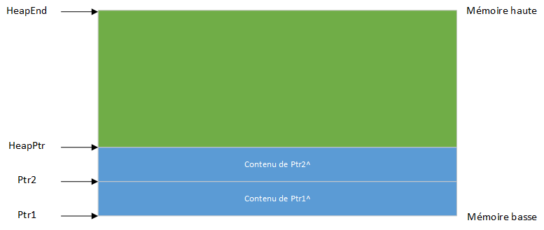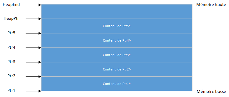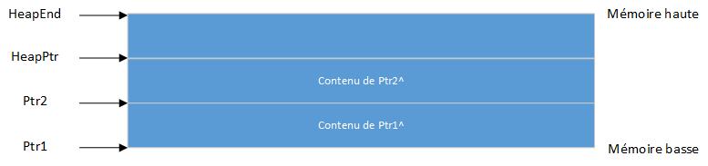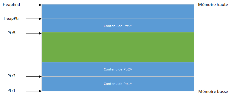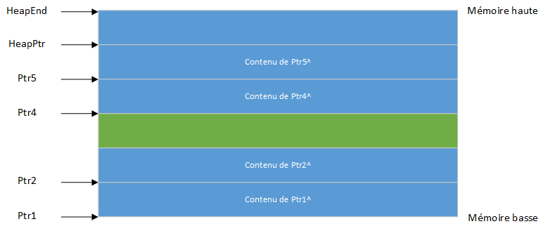 Lorsqu'une variable dynamique n'étant pas la variable la plus élevée du tas est supprimée via Dispose ou FreeMem, le tas devient fragmenté. En supposant que la même séquence d'instructions a été exécutée, puis après avoir exécuté Dispose(Ptr3), un "trou" est créé au milieu de la mémoire tas :