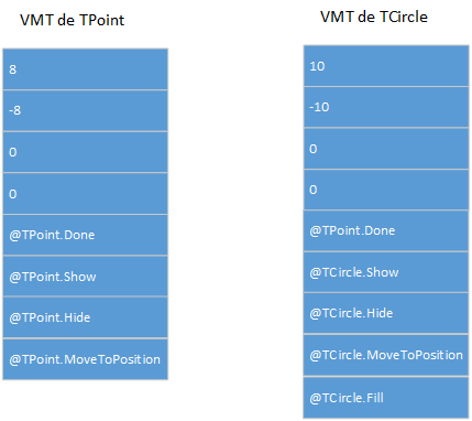 Remarquez comment TCircle hérite des méthodes Done et MoveTo de TPoint, et comment il remplace les méthodes Show et Hide.