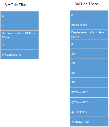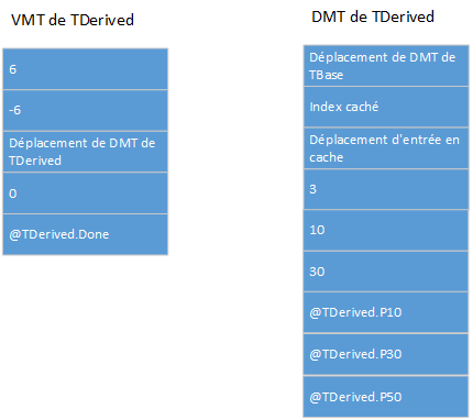 Les images suivantes montrent les dispositions des VMT et des DMT de TBase et TDerived. Chaque petite case correspond à un mot d'entreposage, et chaque grande case correspond à deux mots d'entreposage.
