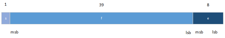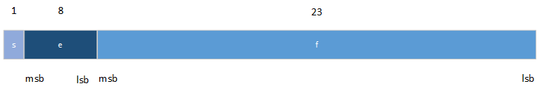 Dans les figures suivant, le MSB signifie bit le plus significatif et LSB signifie bit le moins significatif. Les éléments les plus à gauche sont entreposés aux adresses les plus élevées. Par exemple, pour une valeur de type réel, e est entreposé dans le premier octet, fin les cinq octets suivants et s dans le bit de poids fort du dernier octet.