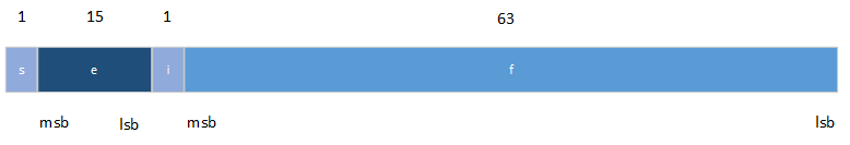 SI 0 ≤ e < 32767 ALORS v = (-1)S * 2(e-16383) * (i.f). FIN SI SI e = 32767 ET f = 0 ALORS v = (-1)S * Inf. FIN SI SI e = 32767 ET f ≠ 0 ALORS v EST UN NaN. FIN SI |
