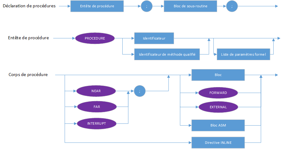 Les procédures et fonctions vous permettent d'imbriquer des blocs supplémentaires dans le bloc de programme principal. Chaque déclaration de procédure ou de fonction a un entête suivi d'un bloc. Une procédure est activée par une instruction de procédure ; une fonction est activée par l'évaluation d'une expression contenant son appel et renvoie une valeur à cette expression.